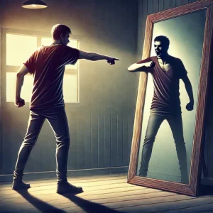 Nu kom je plots iemand tegen die heel direct is en iets naar jou uitspreekt, misschien zelfs kritiek. Dit stukje wat je zelf hebt begraven in je onderbewustzijn, komt plots omhoog omdat het zich identificeert met die persoon. Je gaat hier vervolgens op reageren, maar jijzelf ziet alleen die persoon. Er kunnen 2 dingen gebeuren, meestal zal je kwaad worden omdat men je heeft geleerd dat assertiviteit echt niet kan en onbeleefd is. Je zal die persoon waarschijnlijk onbeleefd vinden en er boos op worden.